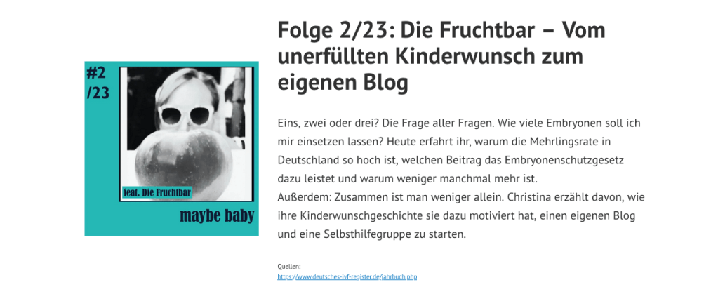 Ich war beim Podcast „maybe baby“ und habe die Entstehungsgeschichte des Blogs erzählt – und auch, wie die Selbsthilfegruppe entstanden ist. Ich hör mich ja selbst nicht so gern reden (wie wohl die meisten von uns ;-)) aber ich freu mich sehr, dass ich dabei sein durfte! Ein großes Dankeschön an Beate (Handling Infertility)!