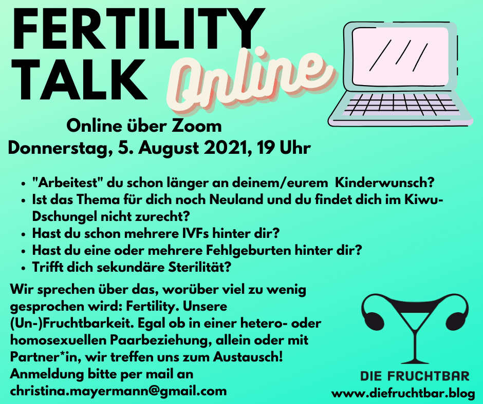 Es ist wieder soweit… Der nächste Fertility Talk findet – nach einem Monat Sommerpause – online am 5. August 2021 um 19 Uhr statt. Ich freue mich über eure Anmeldungen an christina.mayermann@gmail.com. Den Zoom Link verschicke ich dann kurz vorm Treffen.