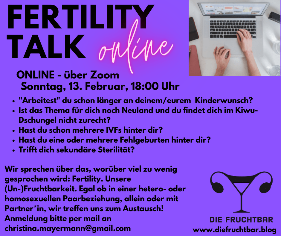 Fertility Talk am Sonntag am 11. Februar 2022 von fraumayermannin Fertility Talk Der nächste Fertility Talk findet am Sonntag, 13.02.2022 um 18 Uhr statt! Um Anmeldung wird gebeten 🙂 Teilen mit: Auf X teilen (Wird in neuem Fenster geöffnet) X Auf Facebook teilen (Wird in neuem Fenster geöffnet) Facebook Gefällt mir Wird geladen … Ähnliche Beiträge